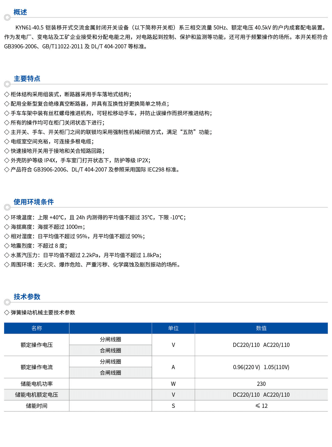 KYN61-40.5铠装移开式交流金属封闭开关设备(以下简称开关柜)系三相交流量50Hz、额定电压40.5kV的户内成套配电装置。作为发电厂、变电站及工矿企业接受和分配电能之用,对电路起到控制、保护和监测等功能,还可用于频繁操作的场所。本开关柜符合GB3906-2006、GB/T11022-2011及DL/T404-2007等标准。